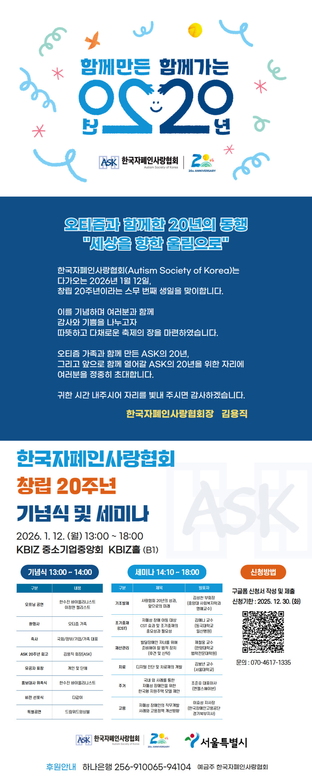 N 📌 한국자폐인사랑협회(ASK) 창립 20주년 기념식 및 세미나 안내