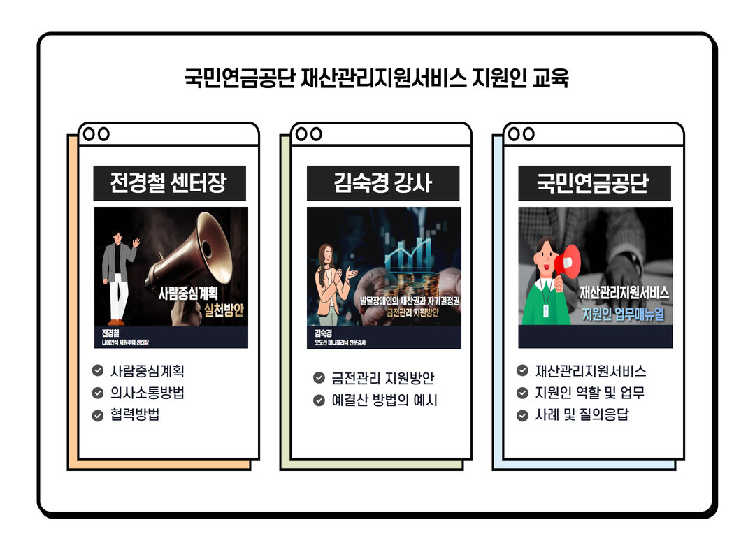 강의 소개 발달장애인 재산관리지원 온라인교육센터 Free 금전관리 전문인력 교육 수강신청하기 Free 보호된 글: 직원교육자료 수강신청하기 Free 국민연금공단 지원인 교육 국민연금공단 지원인 교육과정 수강신청하기