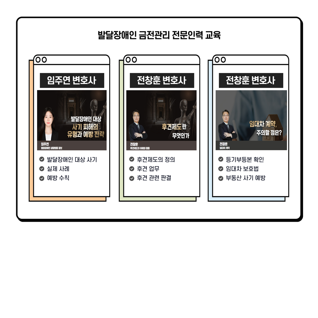 한국자폐인사랑협회는 사회복지공동모금회의 지원을 받아 발달장애인의 가족 및 유관기관 종사자, 재산관리지원서비스 지원인 등 발달장애인의 재산관리를 지원하는 이들의 금융범죄 예방 및 대처방안 등 다양한 생활법률 교육을 통해 금전관리 지원 전문성을 향상하고자 합니다.
