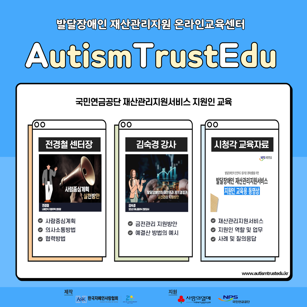 한국자폐인사랑협회는 국민연금공단의 지원을 받아 발달장애인의 가족 및 유관기관 종사자, 재산관리지원서비스 지원인 등 발달장애인의 재산관리를 지원하는 이들의  다양한 교육을 통해 지원인 전문성을 향상하고자 합니다.