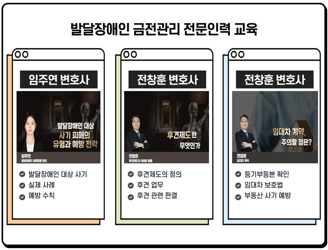 한국자폐인사랑협회는 사회복지공동모금회의 지원을 받아 발달장애인의 가족 및 유관기관 종사자, 재산관리지원서비스 지원인 등 발달장애인의 재산관리를 지원하는 이들의 금융범죄 예방 및 대처방안 등 다양한 생활법률 교육을 통해 금전관리 지원 전문성을 향상하고자 합니다.